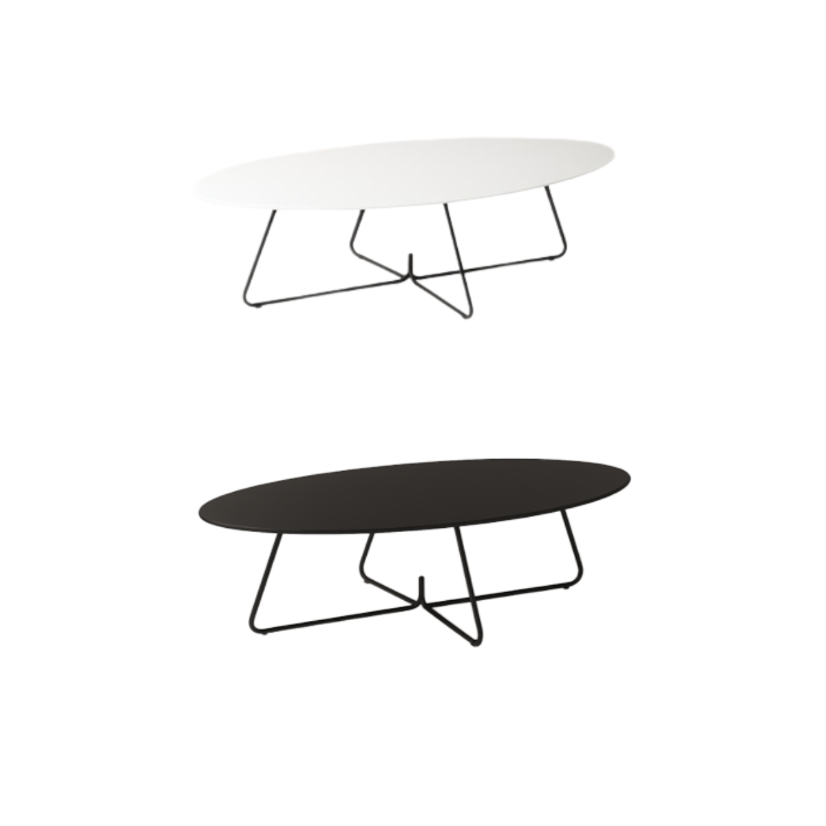 Oval coffee table measuring 1200 × 500 × 270 mm, featuring an MDF laminated top and a steel wire frame.